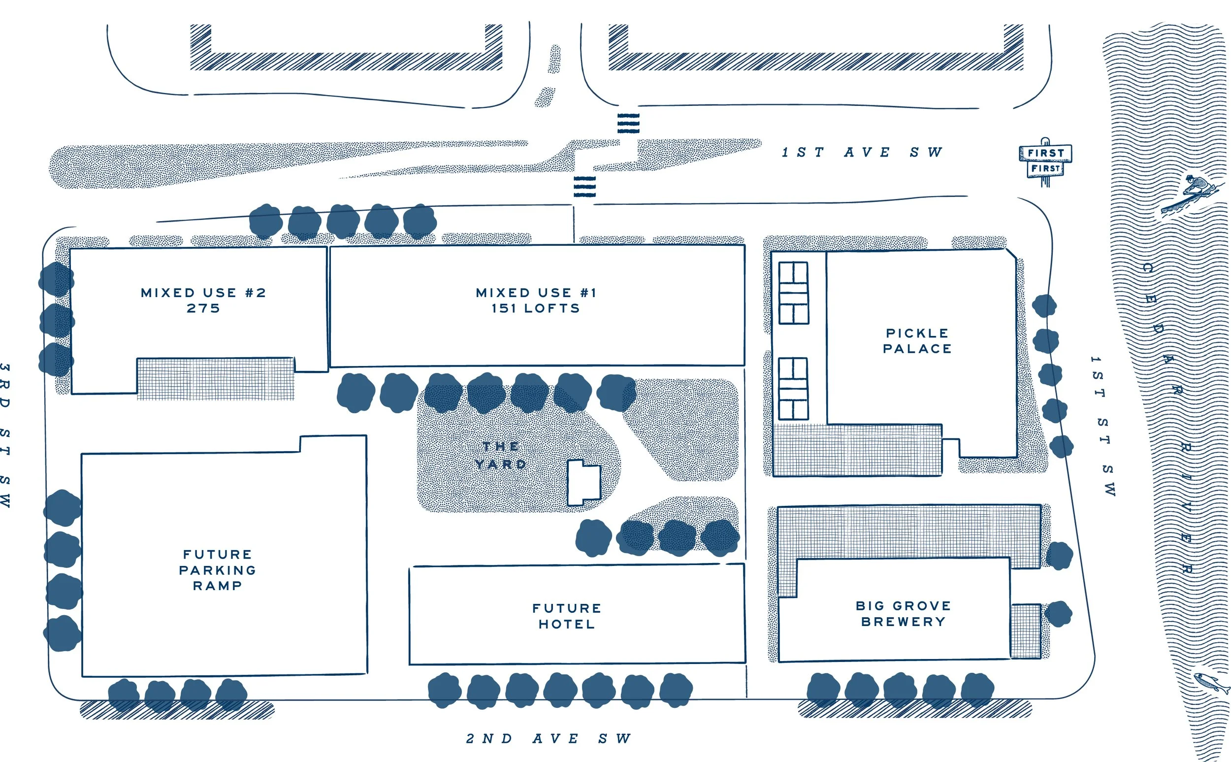 Kingston Yard is, at its core, a place to gather and enjoy. We welcome visitors to the west bank of the Cedar River, just as the namesake-settler, David King, did with his ferry crossing 175 years ago.